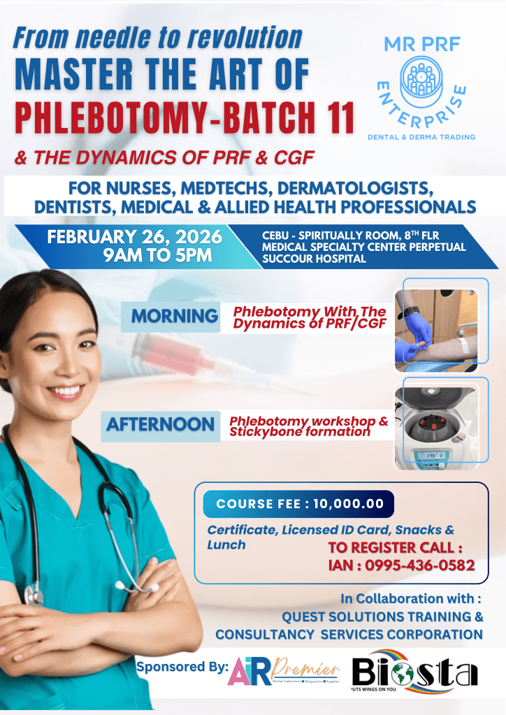Join us for an exciting and in-depth lecture designed specifically for healthcare professionals, including nurses, medical technologists, dermatologists, dentists, and allied health practitioners. This comprehensive program will enhance your expertise in phlebotomy techniques and introduce you to the innovative uses of Platelet-Rich Fibrin (PRF) and Concentrated Growth Factor (CGF) in regenerative medicine and dentistry.